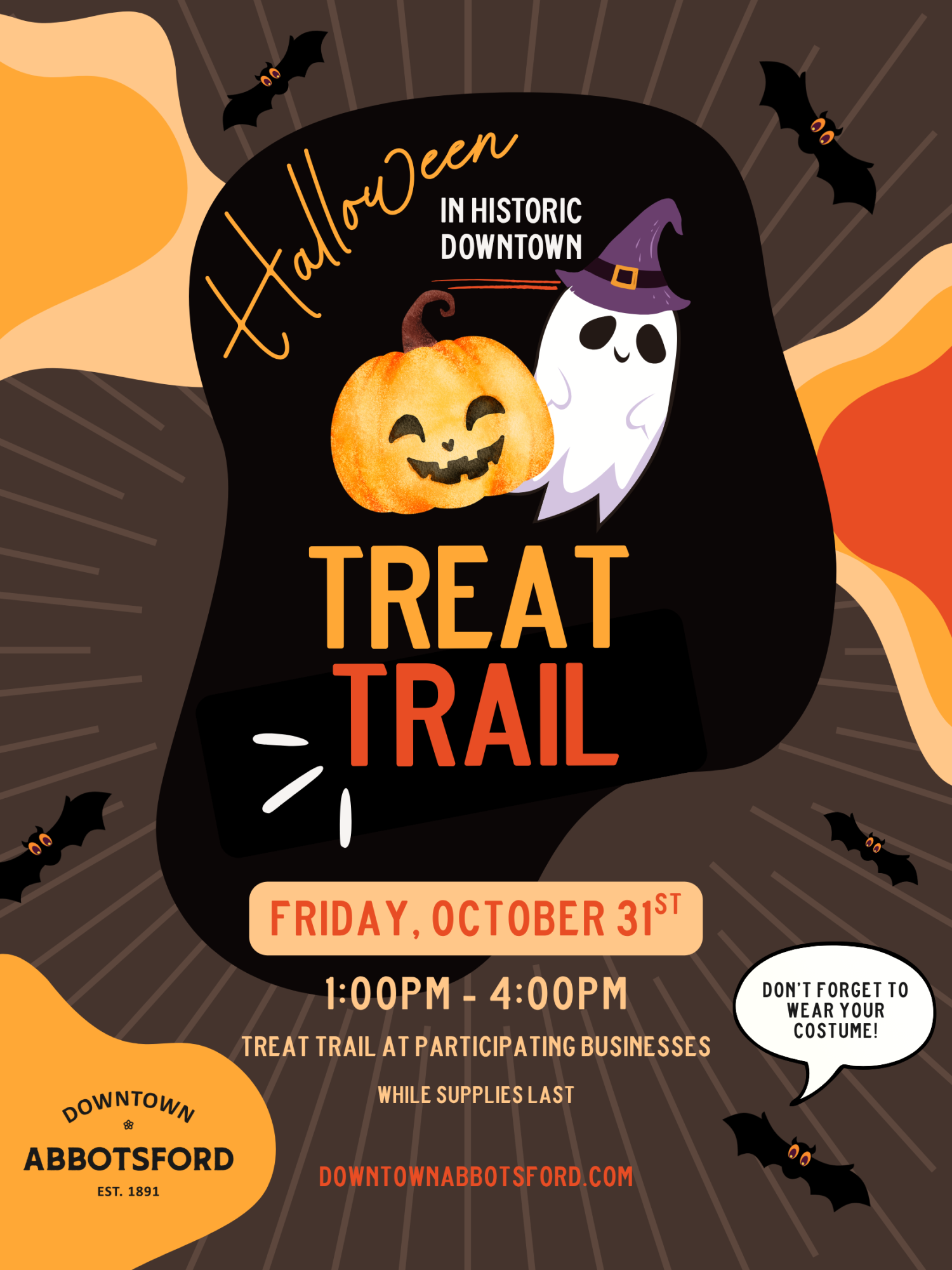 Trick or treating is while supplies last. Please note that some businesses may run out of candy. In this case, flash a smile and continue onto the next stop on the Treat Trail!